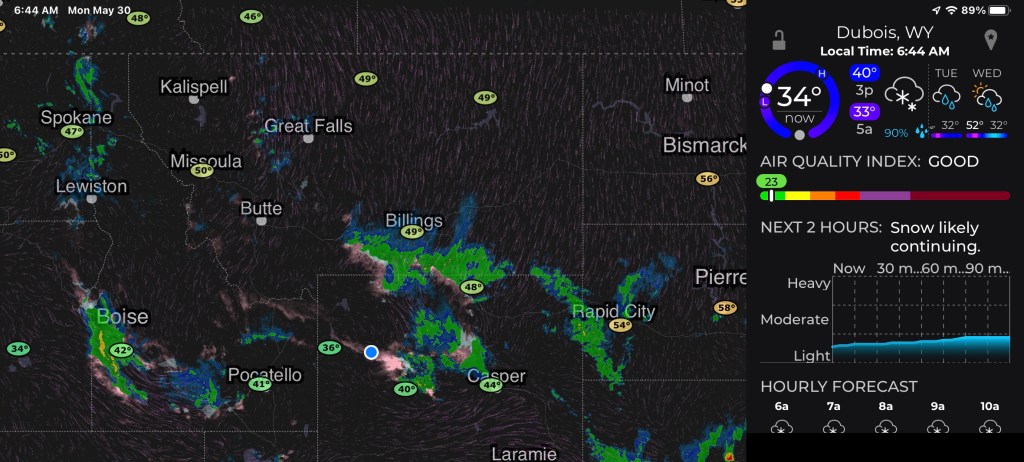 The evening of the 24th we arrived in Dubois WY wet and cold. Our first stop was a convenience store on the outside of town. The owner made us fresh coffee “on the house” and urged us to warm up and get dry. If we hadn’t had a place to stay he was going to make calls and help. We then stopped at a grocery store and a young woman, Sara, approached an asked questions about the ride. She said she wanted to learn more about cycle touring and asked to join us for the next day as we road to Lander. We told her the weather was going to be awful but she was welcome to ride.