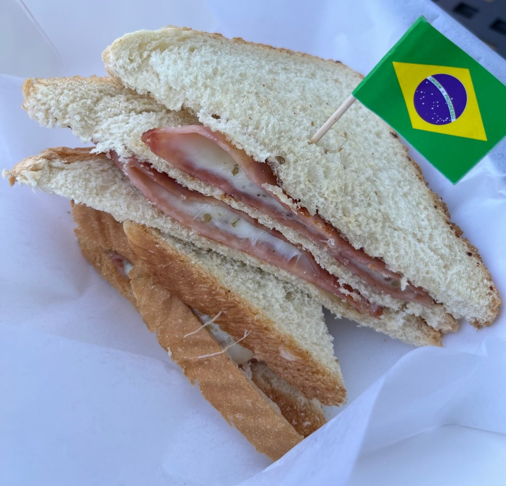 At mile 35 we were just about to St Paul and needed a break and food. We found a Brazilian sandwich shop/market and stopped to check it out. Such a cool place. Lots of grocery items from Brazil, several guys watching soccer, and some traditional Brazilian sandwiches. I tried the cachorro quente prensado (panini pressed hotdog) and Mel had the misto quente (ham and cheese sandwich). We split a coke, got some Oreo-like cookies and refilled the water bottles.