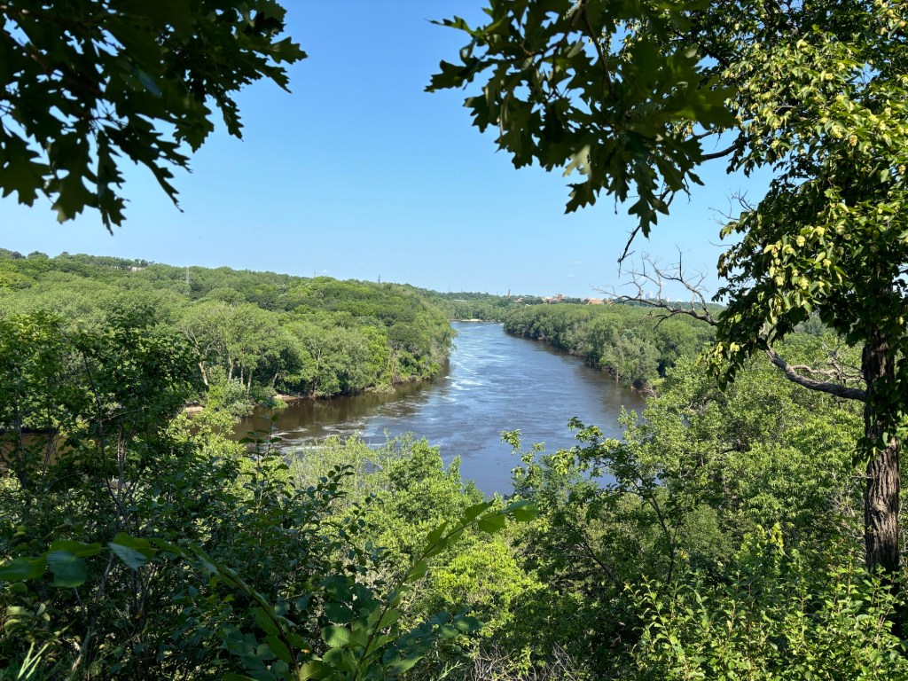 Our first day of this ride started in a state park and included almost 20 miles of country roads, a town, and then trails in the woods/fields of Northern Minnesota. By contrast, the last day was going to be all urban riding. We left the hotel and wove our way through Coon Rapids, a suburb on the north side of Minneapolis. We connected to a fantastic set of trails that ran along the river through the heart of Minneapolis and St Paul. It was wonderful riding, bridges, dams, historical sites, shaded trails, trains, barges, and cool architecture. Our pace was slow so we could enjoy the scenery. There were a couple places where we saw the impact of the recent heavy rains and flooding. On one section, part of the trail had washed away so we walked it. At the confluence of the Minnesota and Mississippi Rivers, the water was still very high. There were dozens of barges all along the banks.