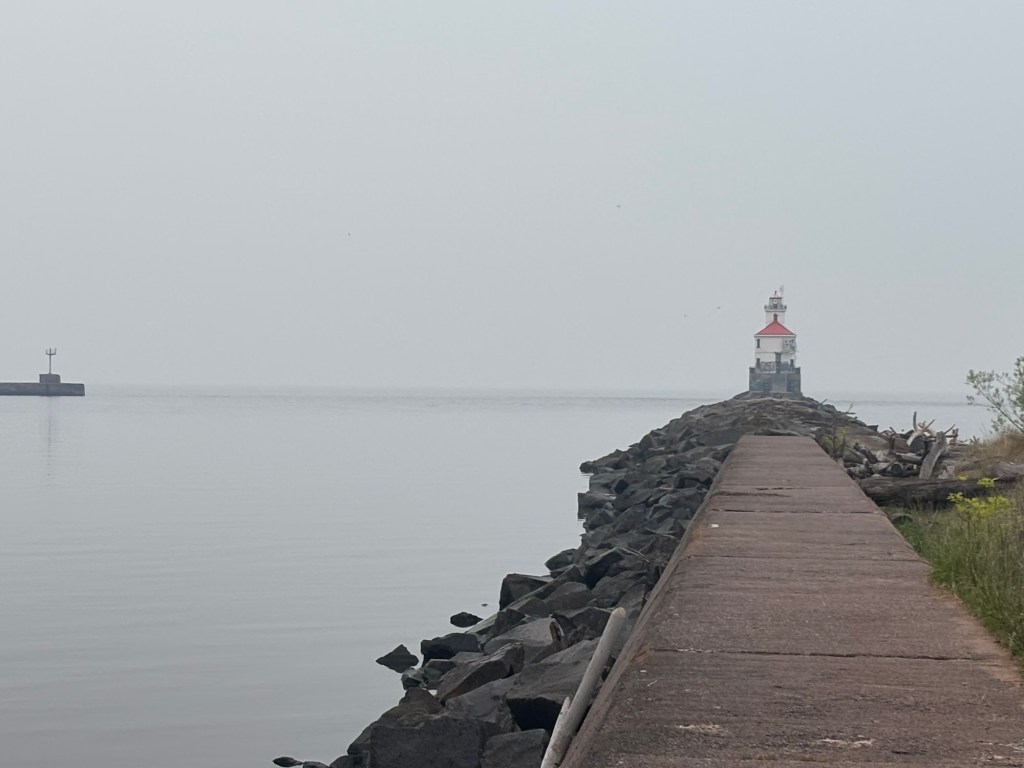 I always like to start and end our rides at a state line, or body of water, or landmark. Something just feels right about that. This year we started at the light house at Wisconsin Point which marks the main entry from Lake Superior to the cities of Superior and Duluth. It was neat to see, but not a calendar type view. It was overcast, starting to rain and air was not clear due to the fires in Canada. Still a worthy start point seeing the vastness of the lake merging into the gray sky.