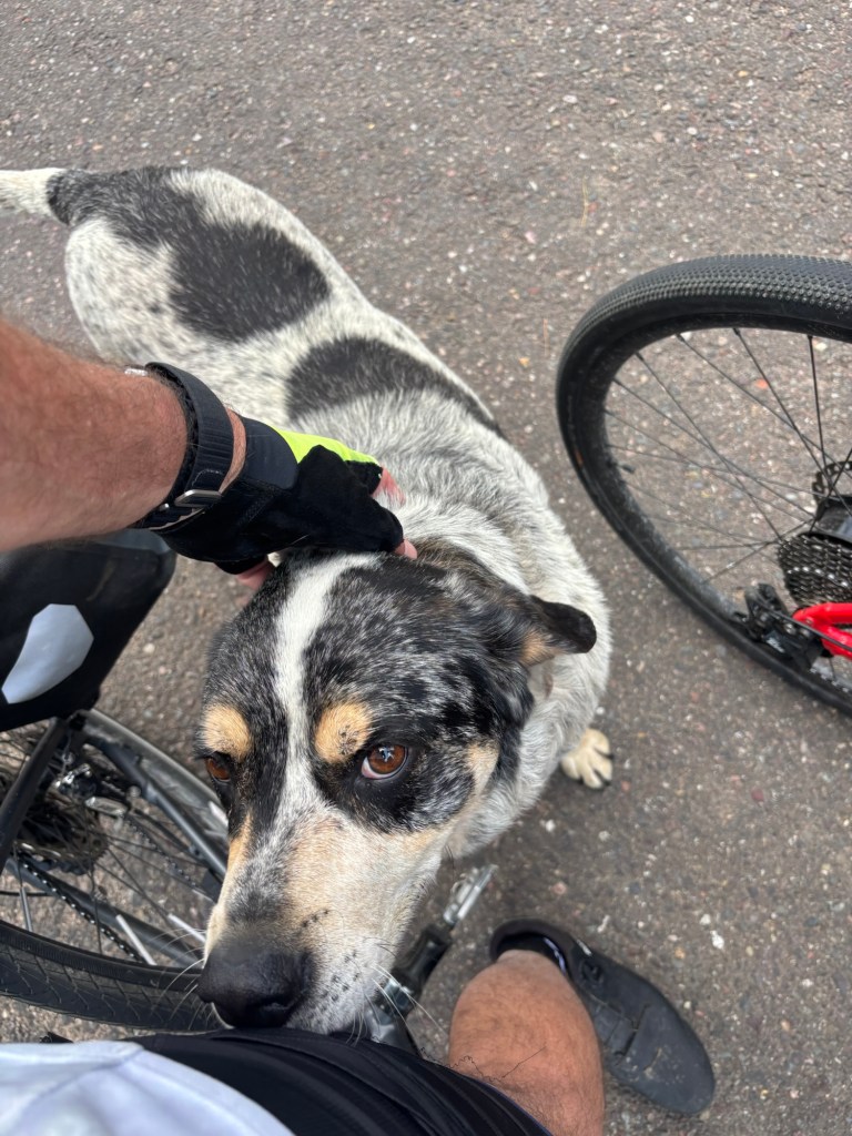 The second was one I spotted in the shade of a farm yard. When I saw him, I started talking to him nicely and grabbed my spray. He got up and ran towards me, but with a wagging tail and a big dog smile. I put the spray away and he met me on the road for some petting and licking and then trotted to Mel for some of the same. Nice pup – and friendly just like all the people we saw today.